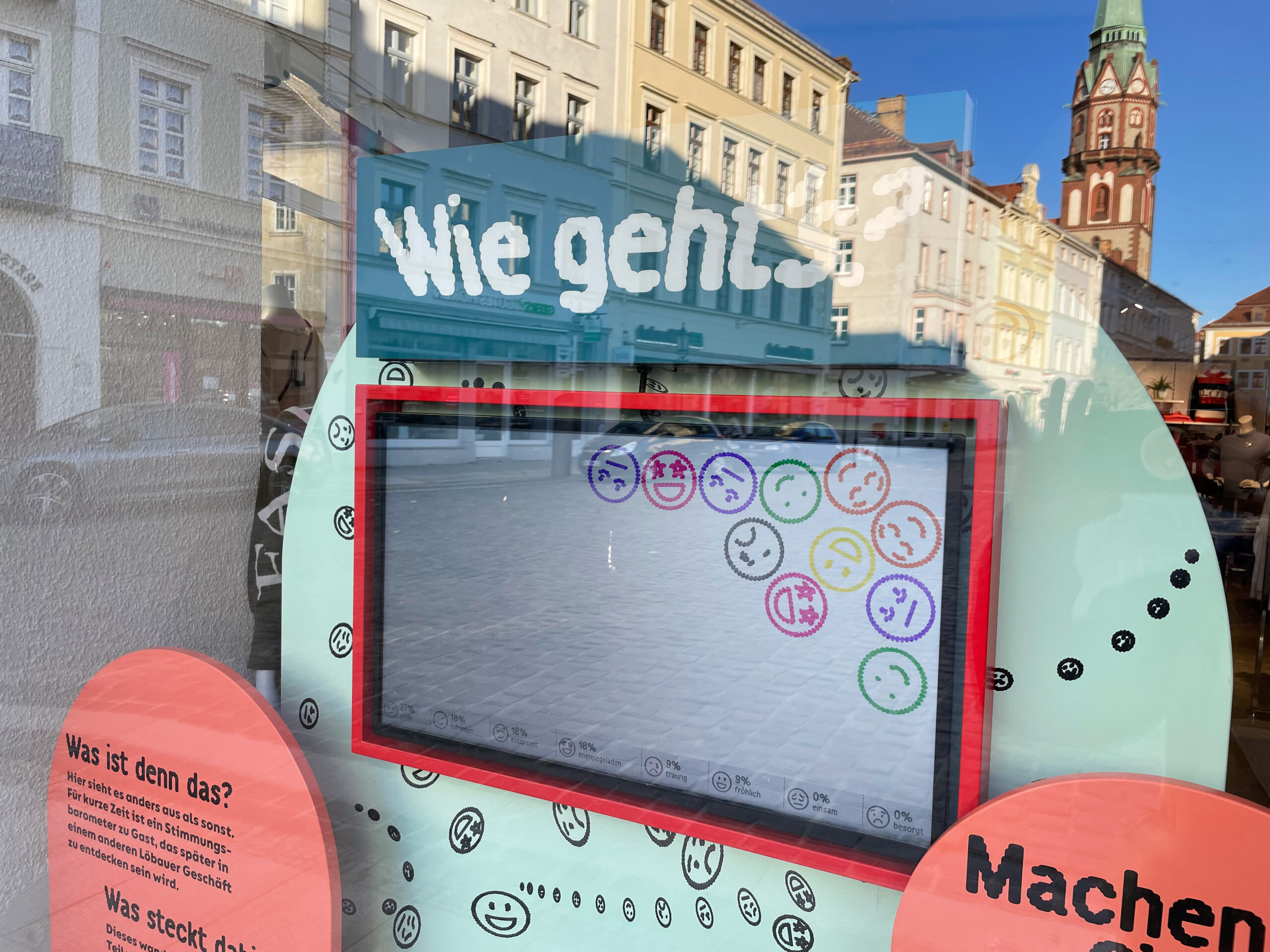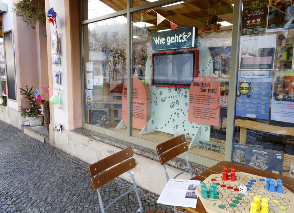 The interactive shop window installation ‘Löbau – Wie geht’s’ (Löbau – How are you?) was designed as part of the outreach programme ‘Museum unterwegs’ (Museum on the move) of the German Hygiene Museum in Dresden. It invites the people of Löbau to fill a mood barometer with life: they can use their own smartphones to anonymously share their current mood. The answers are immediately visible on a monitor. On the back, there is the option to fill out an analogue, in-depth survey.
